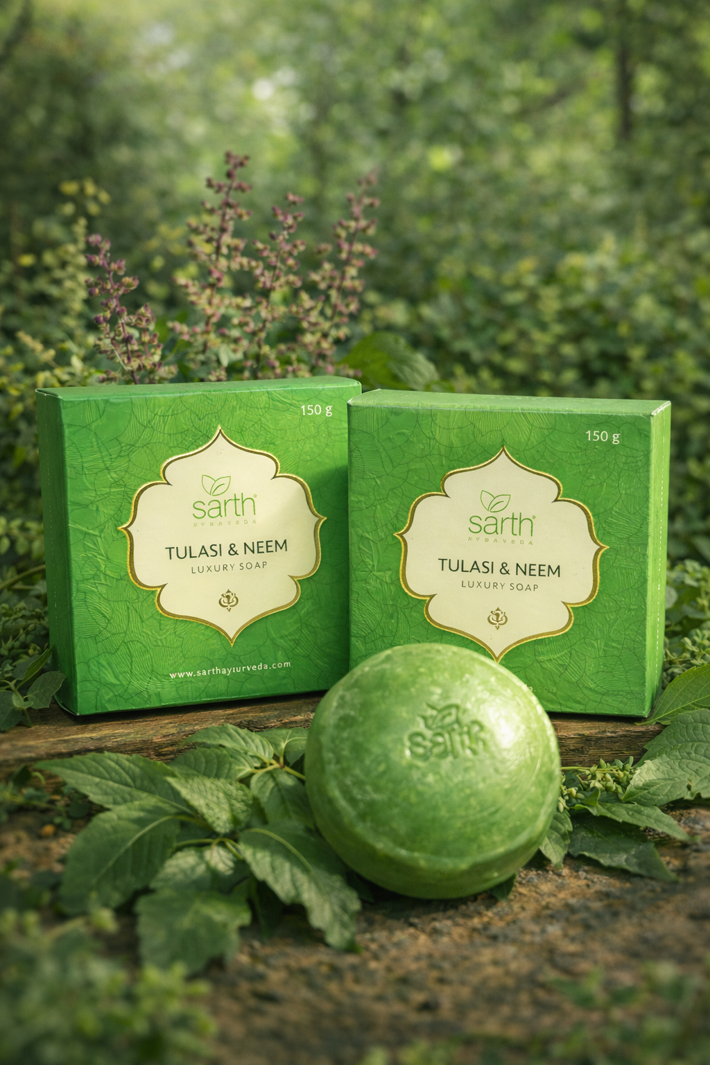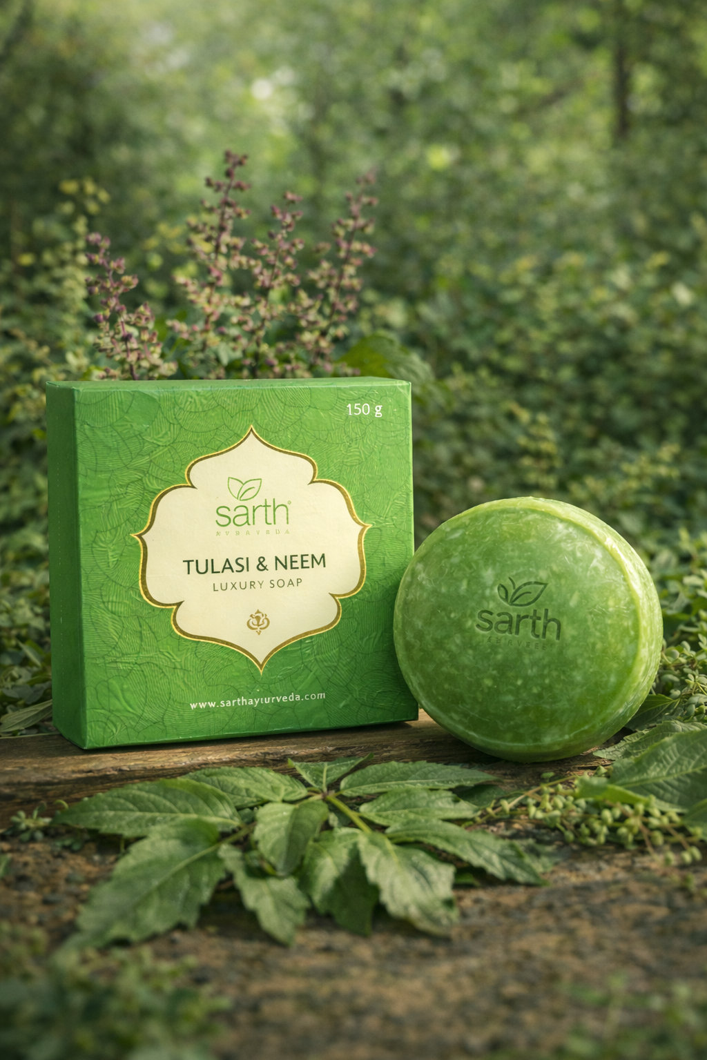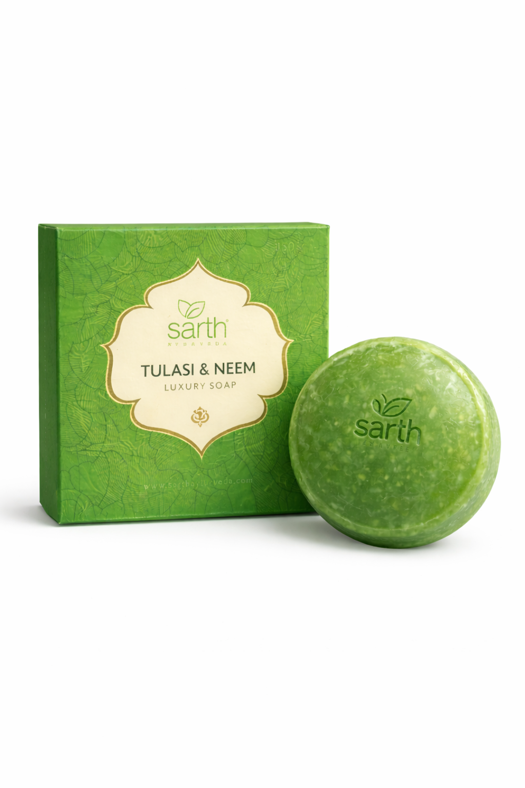 Sarth Tulasi & Neem Luxury Soap is a gentle Ayurvedic cleansing bar enriched with the natural goodness of Tulasi and Neem. Known for their purifying and skin-soothing properties, these herbs help cleanse the skin deeply while supporting a healthy, balanced complexion.